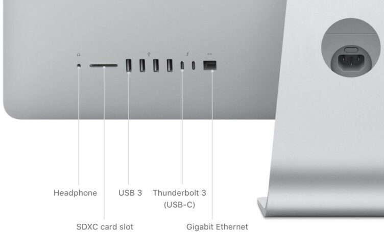 Los nuevos iMac continúan equipados con dos puertos Thunderbolt 3(USB-C), cuatro puertos USB 3, un conector para auriculares, una ranura para tarjetas SD y un puerto Ethernet Gigabit.